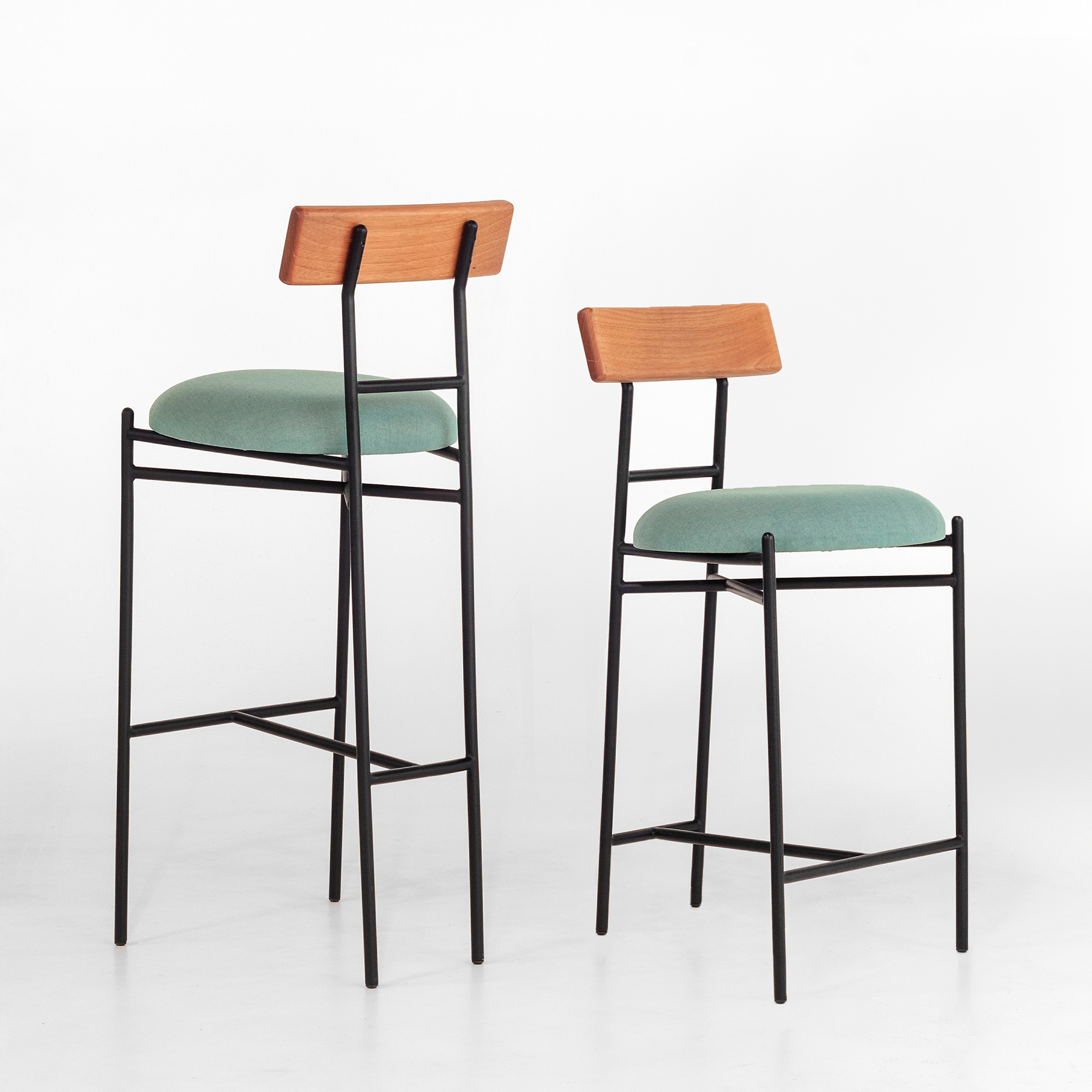 Banqueta com estrutura de aço, assento estofado e encosto em madeira maciça. Possui duas opções de altura.
