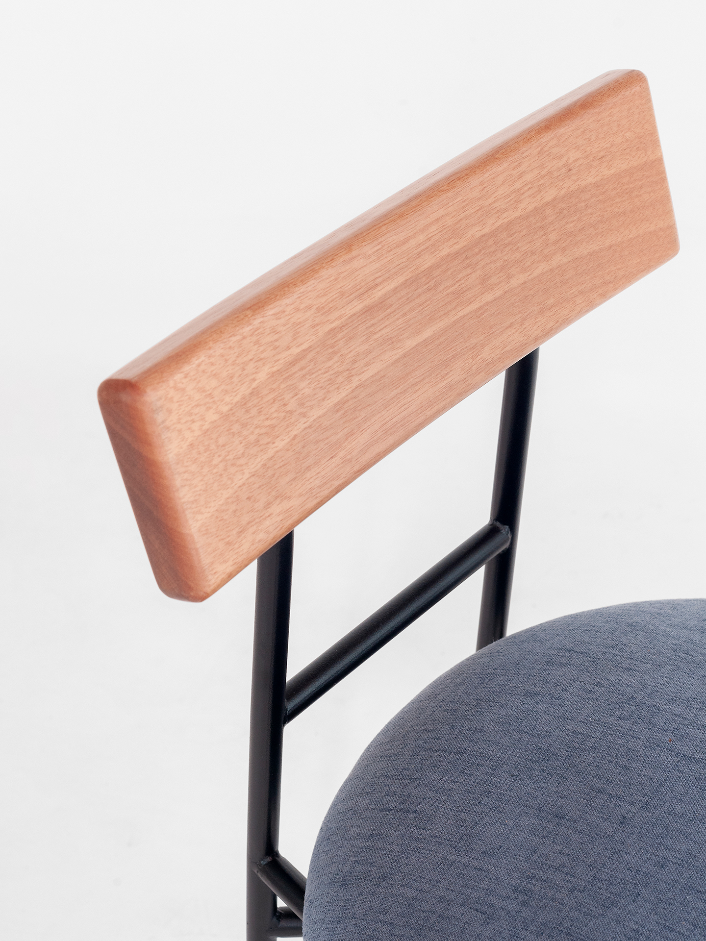 Cadeira com estrutura de aço, assento estofado e encosto em madeira maciça.