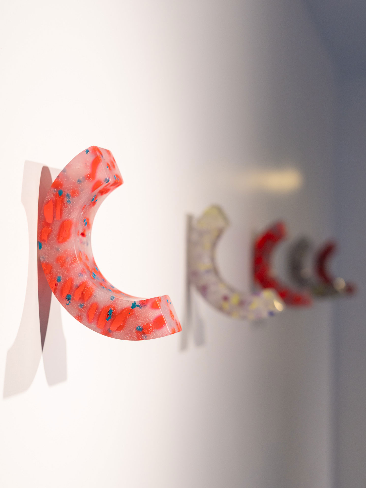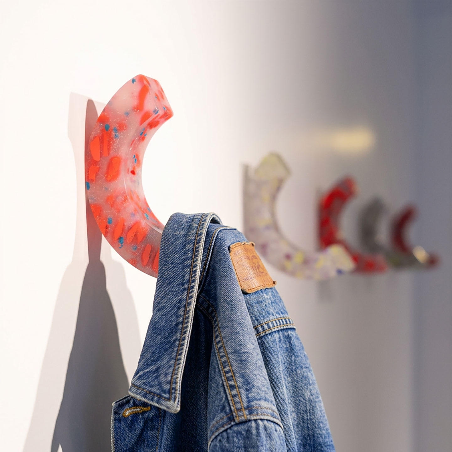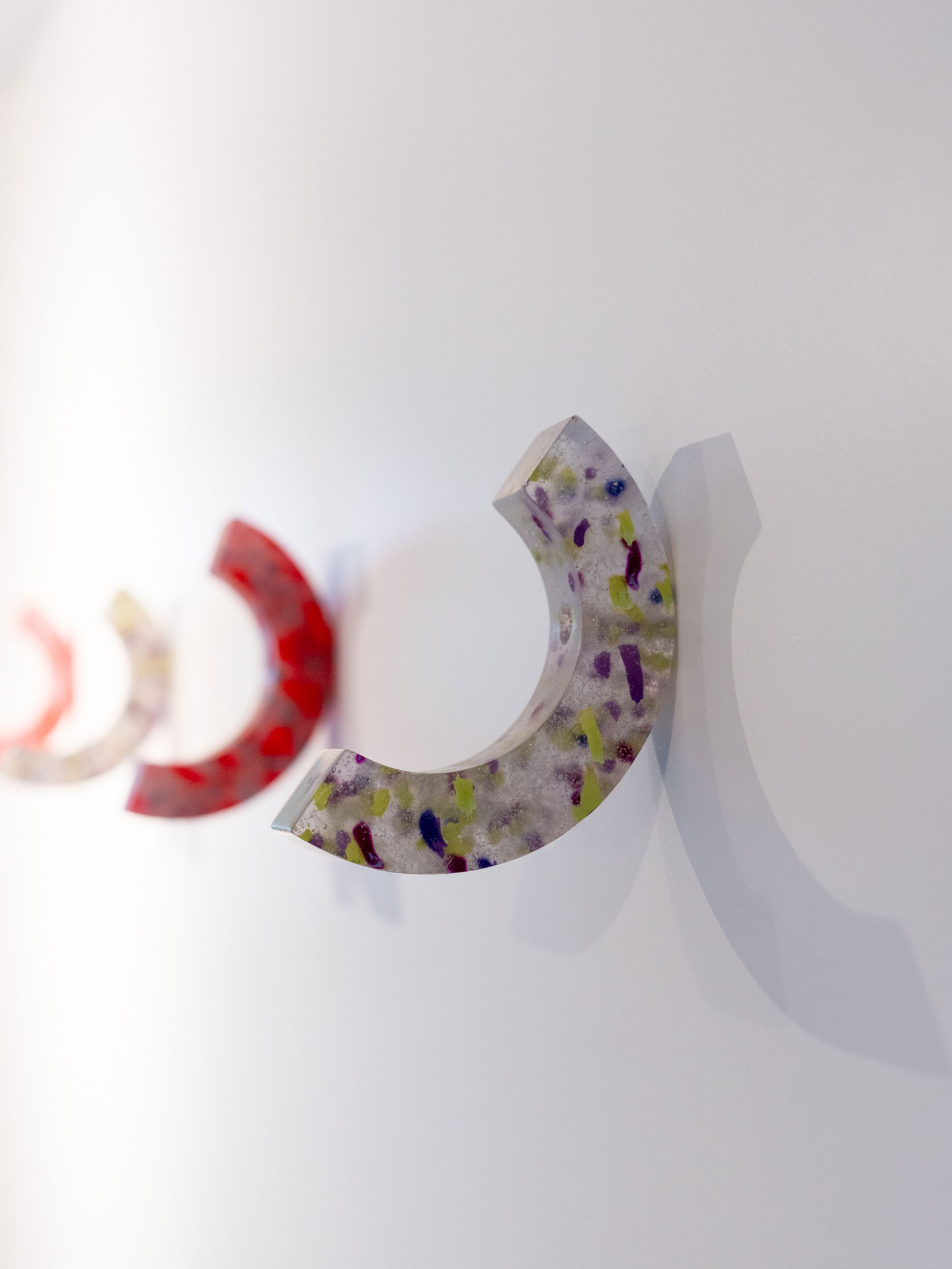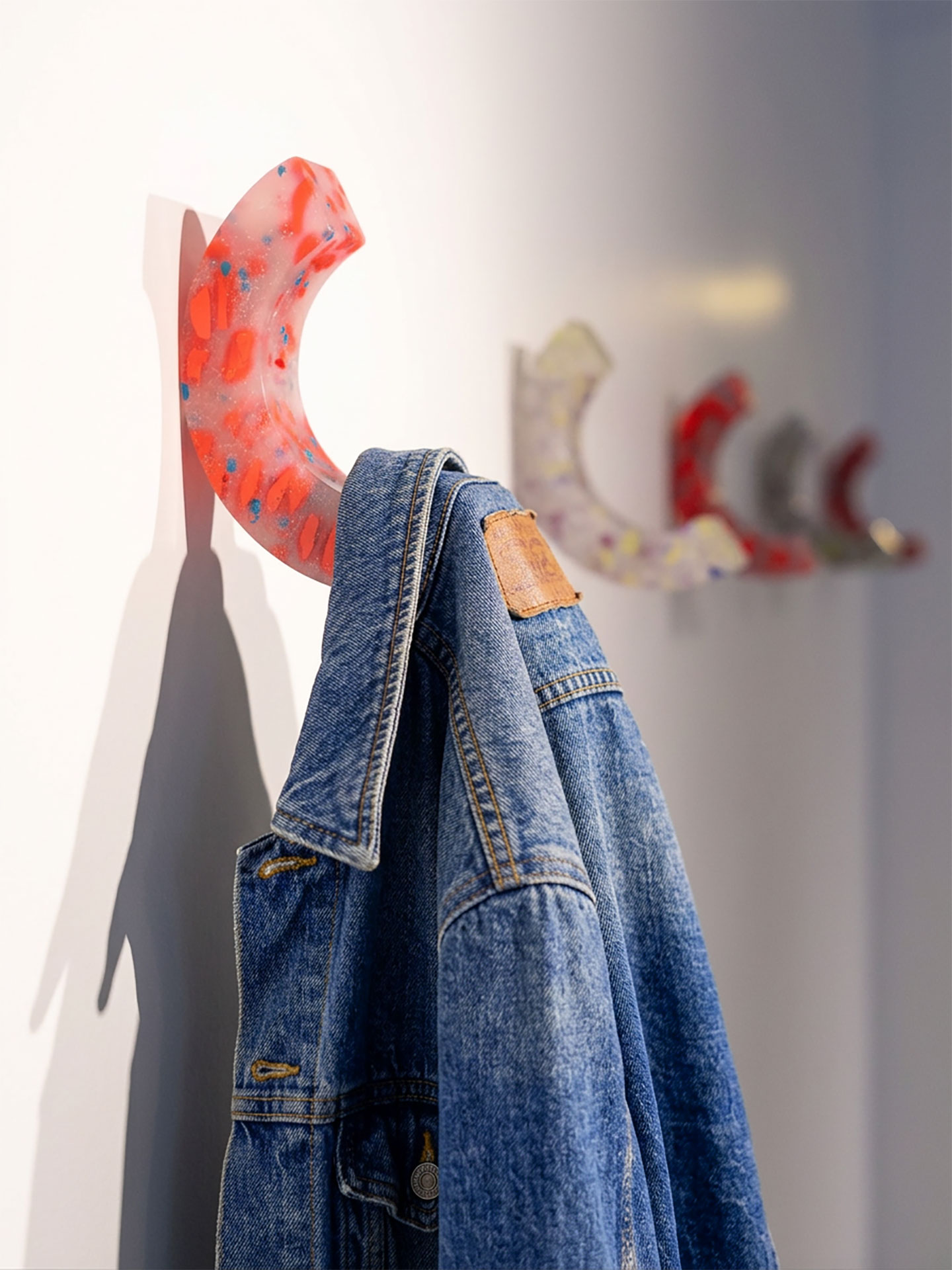 A parte translúcida é gaveta, nicho e prateleira de geladeira, sim, isso mesmo! Já os pigmentados são refugo de variadas indústrias, e assim forma-se um combinado resistente e translúcido: flocos inesperados com cor surgem como pequenas interferências gráficas naturais.