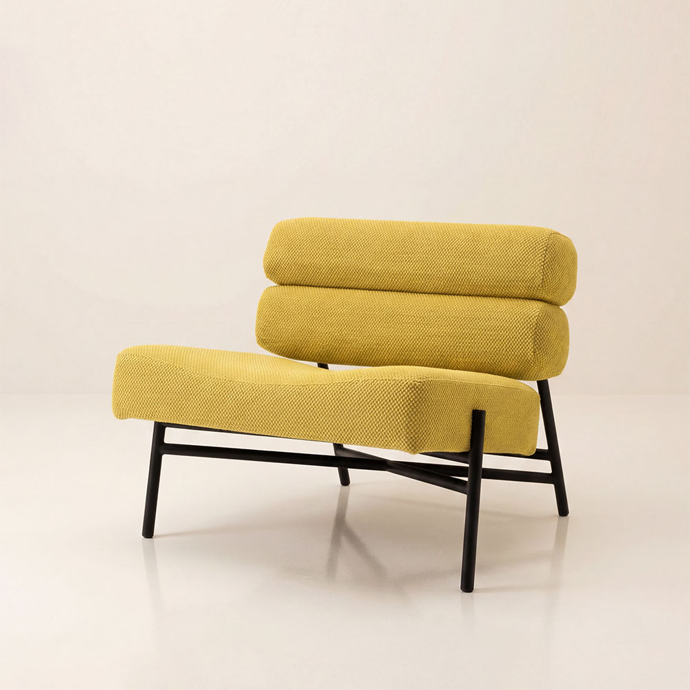 A estrutura é em aço carbono. Na estofaria, a liberdade é total: a poltrona pode ser toda em lona — disponível em diversas cores — ou ganhar personalidade extra com o encosto em bouclê, criando combinações únicas para cada projeto.