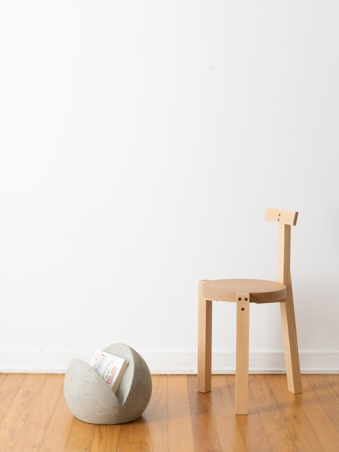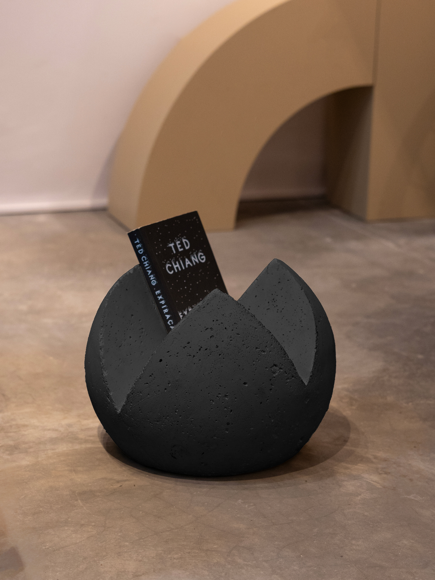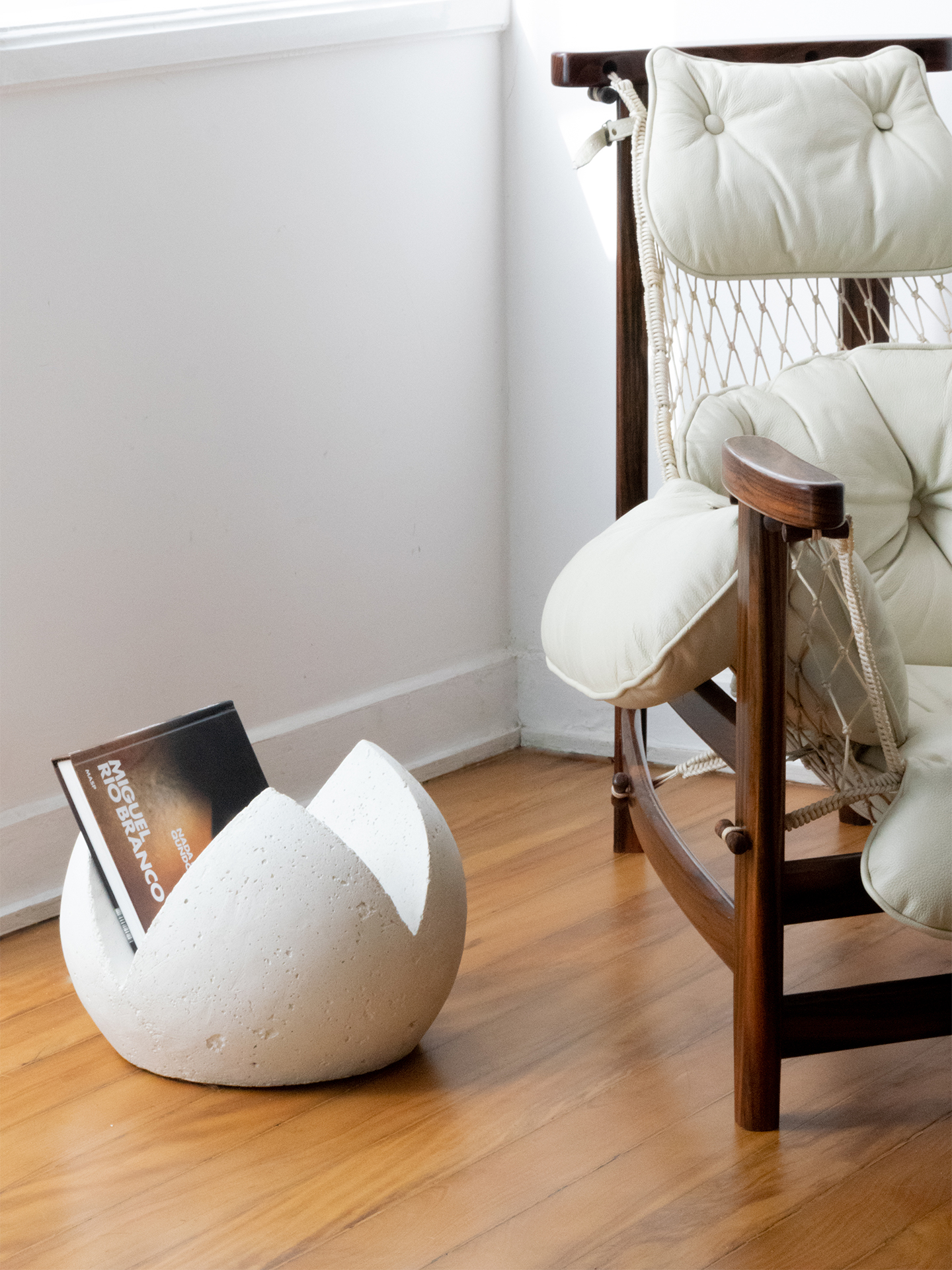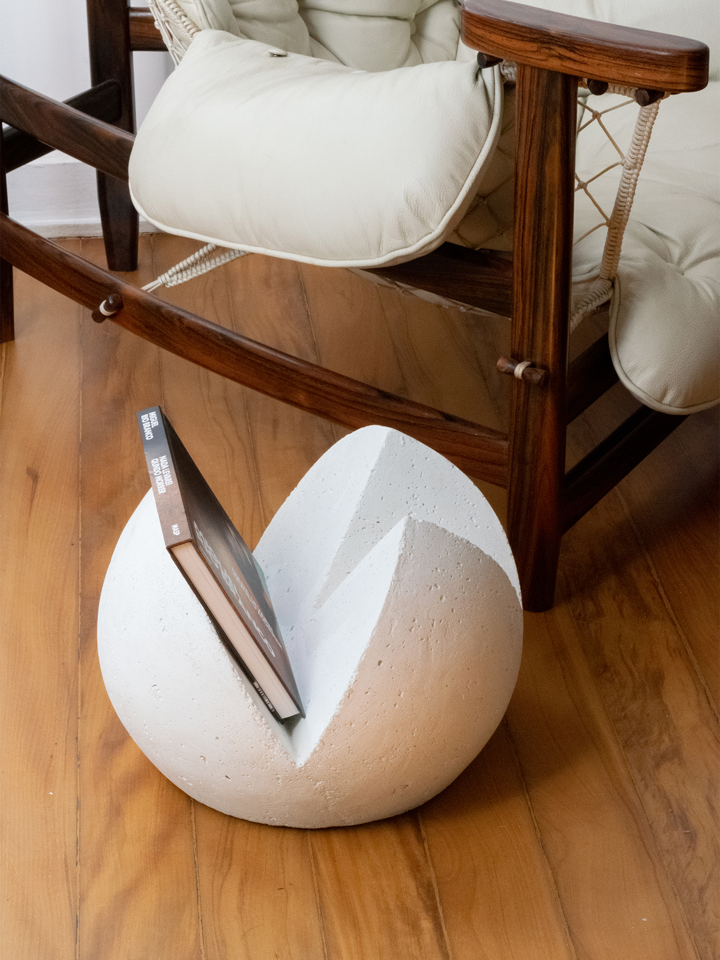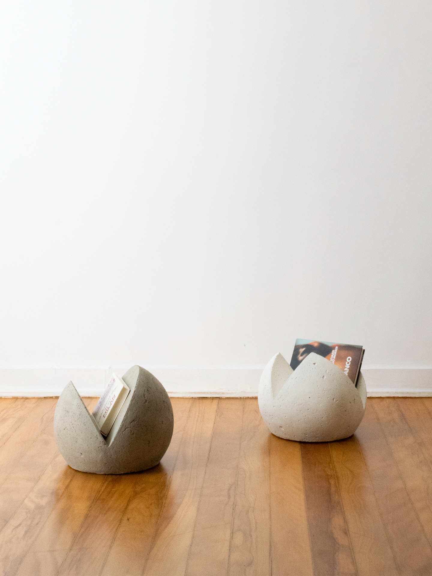 Revisteiro de concreto. Tem seu formato singular e simples: uma esfera com a base plana e fendas que funcionam como recipientes.